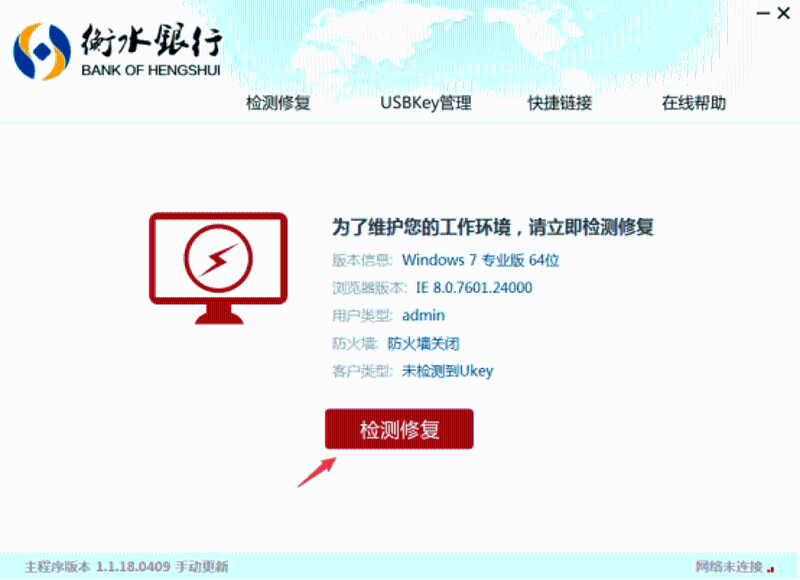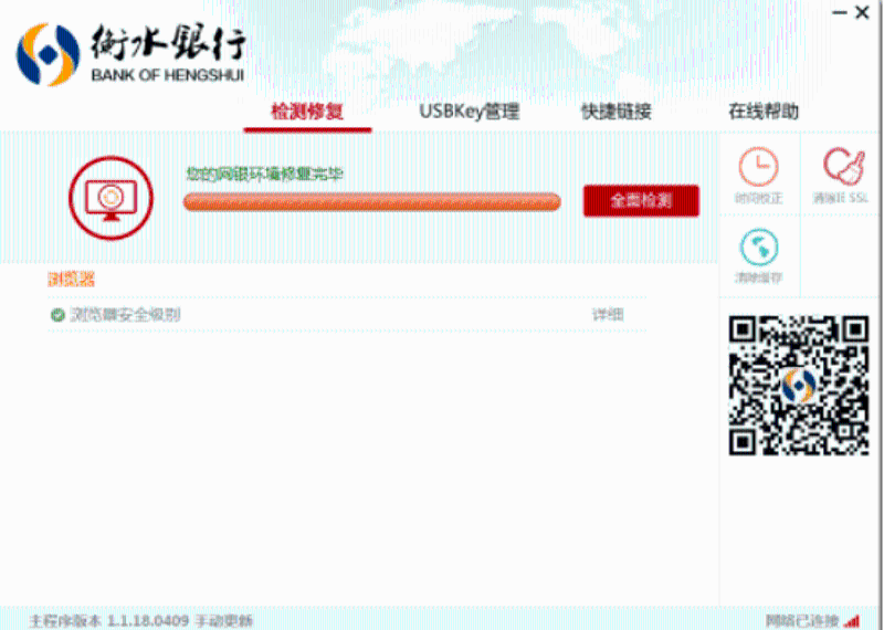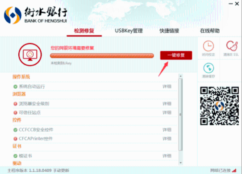 請您首次在登陸二代網(wǎng)上銀行系統(tǒng)之前,到衡水銀行官網(wǎng)首頁左側(cè)點擊“網(wǎng)銀助手”進行系統(tǒng)檢測、修復(fù),如不進行網(wǎng)銀助手修復(fù)工作可能會對使用二代網(wǎng)上銀行系統(tǒng)造成不便。網(wǎng)銀助手主要對電腦的操作系統(tǒng)、IE瀏覽器配置、安全控件、根證書等相關(guān)內(nèi)容進行檢測并修復(fù),檢測、修復(fù)工作將有助您正常使用二代網(wǎng)銀,檢測、修復(fù)完成后請立即重啟計算機。如下圖所示: